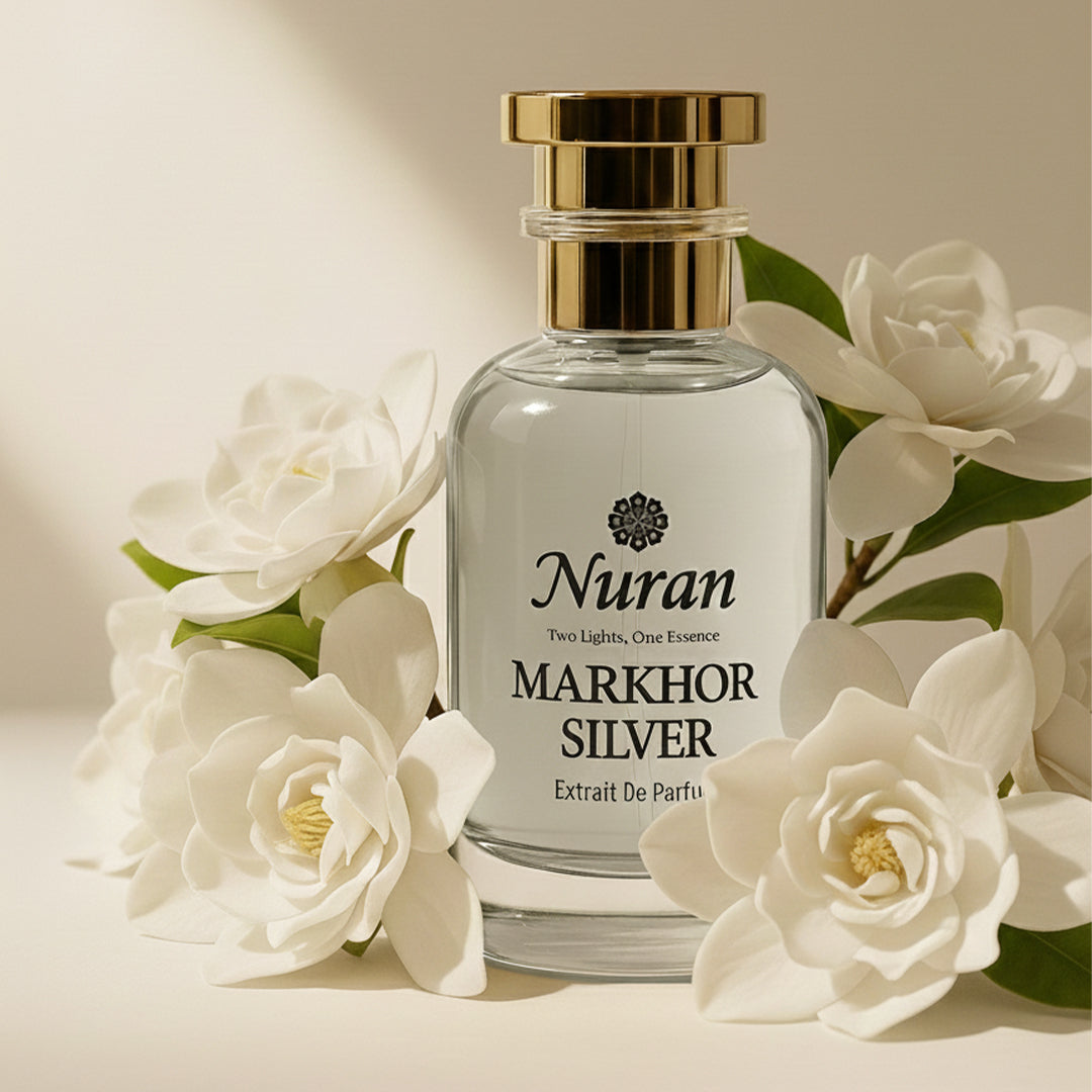 Introducing Markhor Silver by Nuran, a true symbol of excellence in perfumery. This is an Extrait De Parfum, meaning it contains the highest concentration of fragrance oils, delivering an exceptionally long-lasting and potent scent experience.